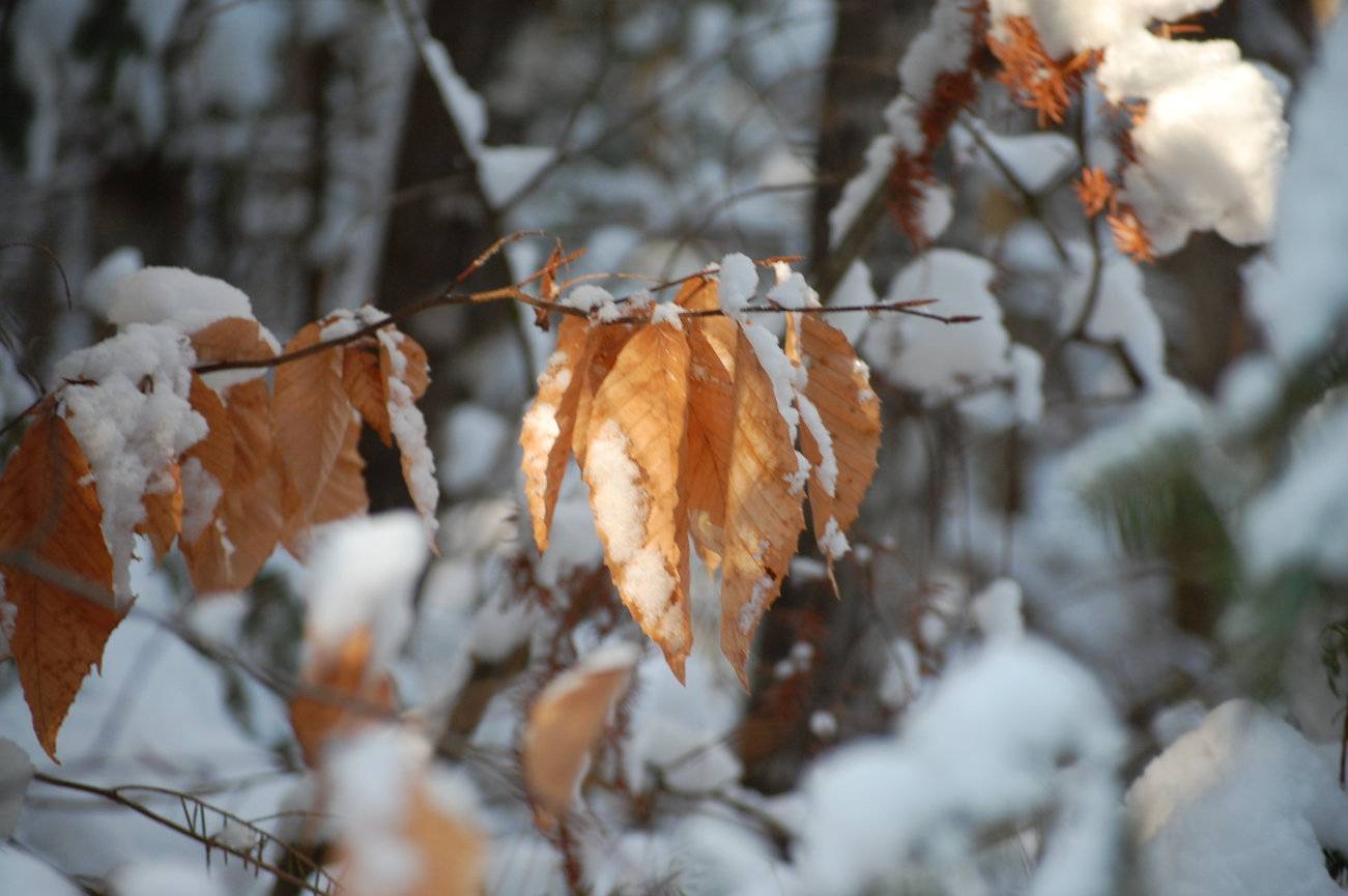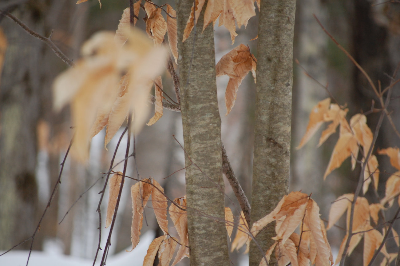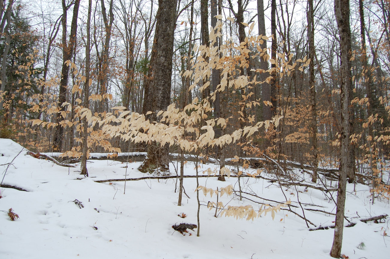 Leaves on young trees and lower branches of large trees often remain through winter, dry and bleached.