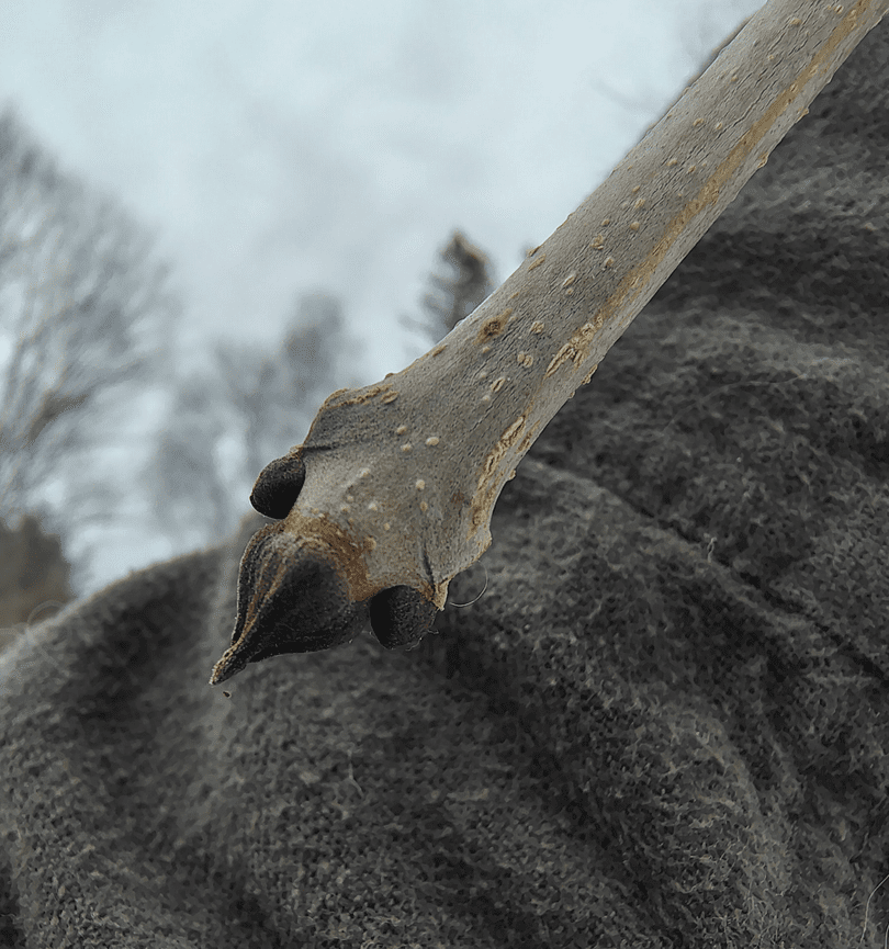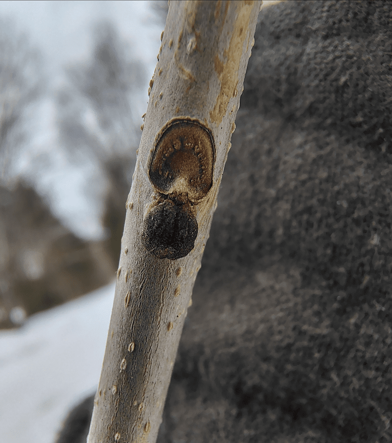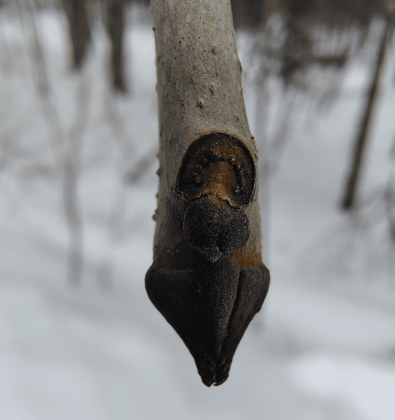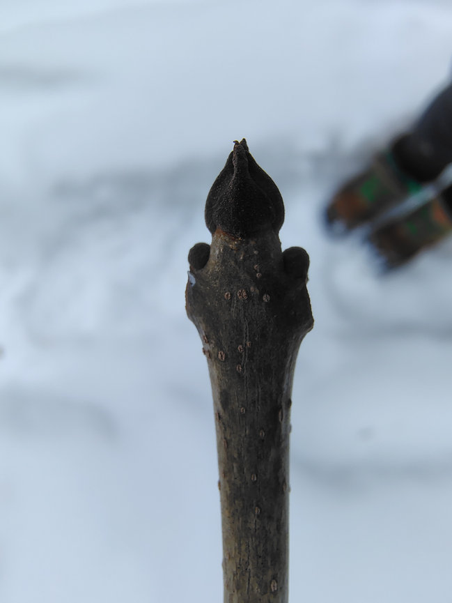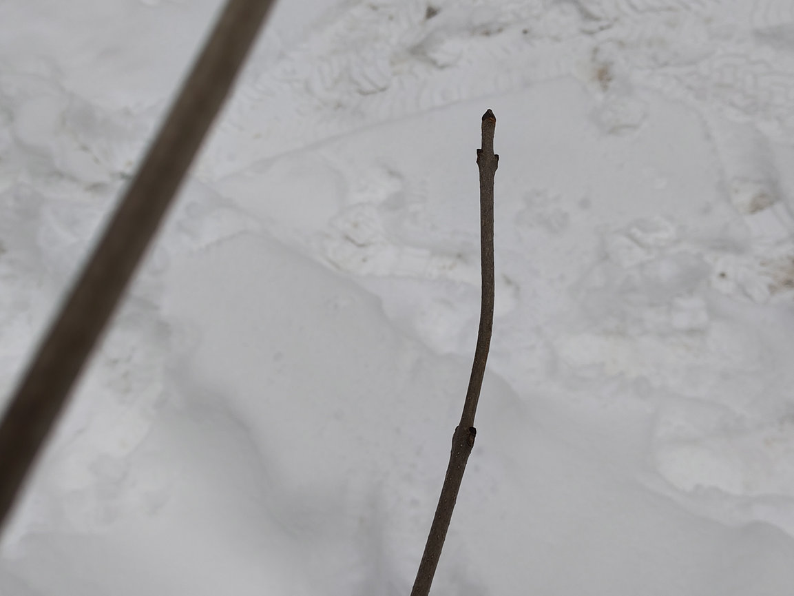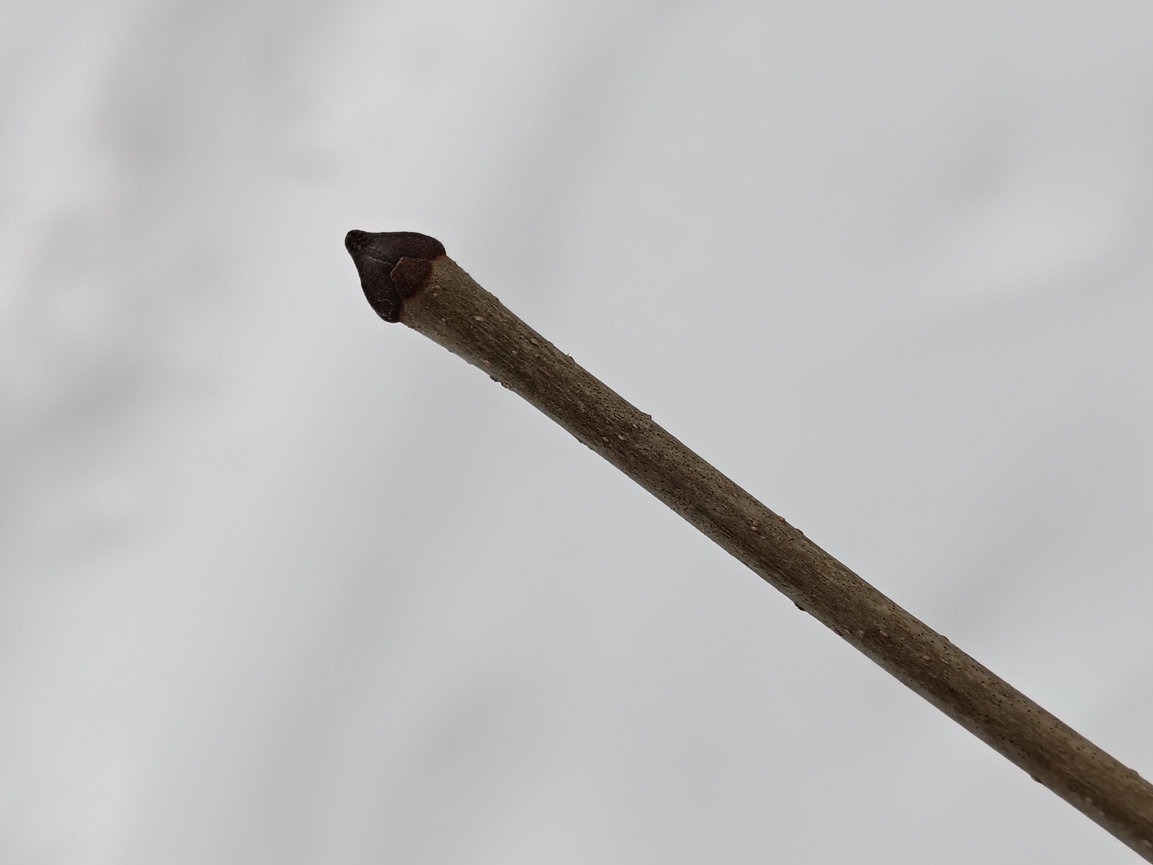 Terminal bud is 0.4 ⇔ 1 centimeters long, wide, pointy, dark brown.